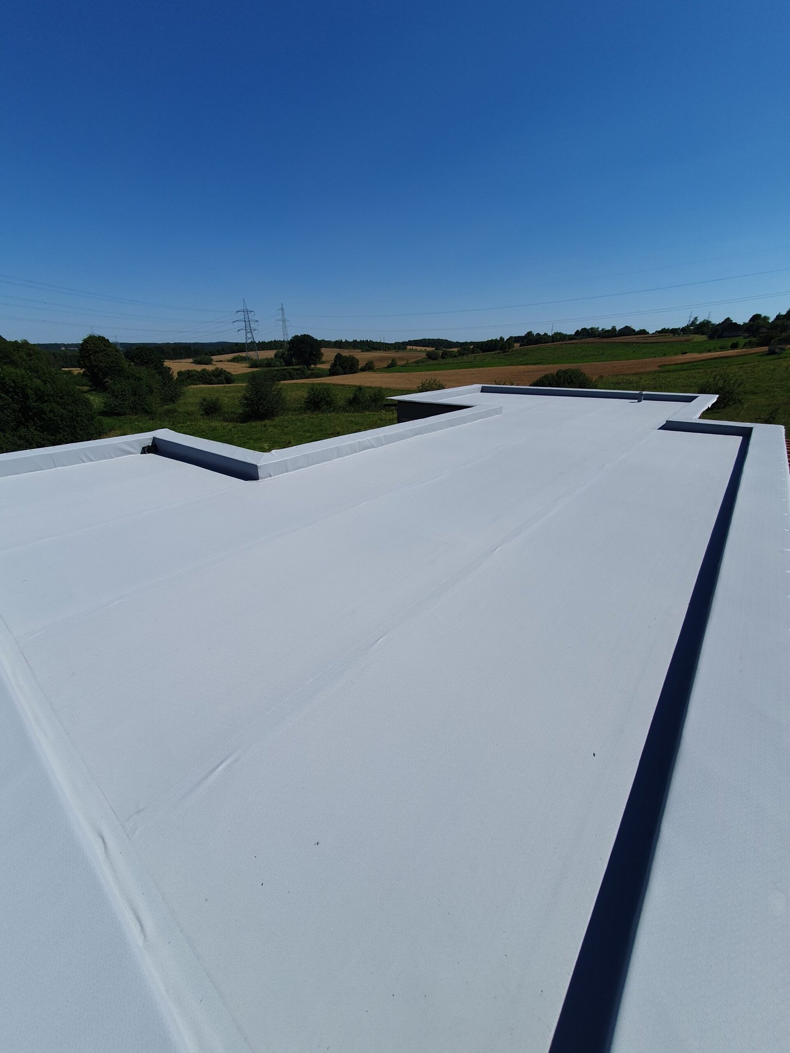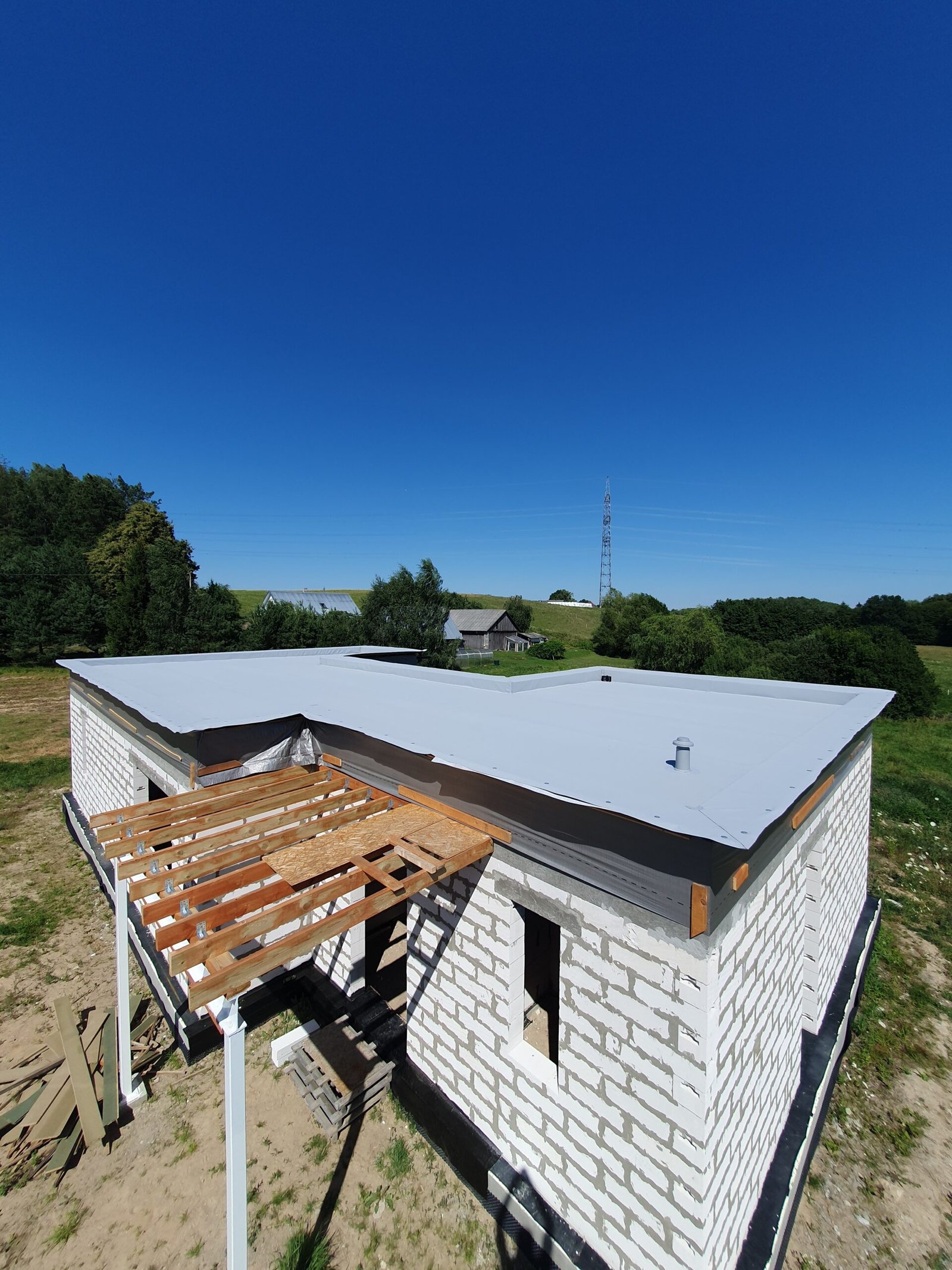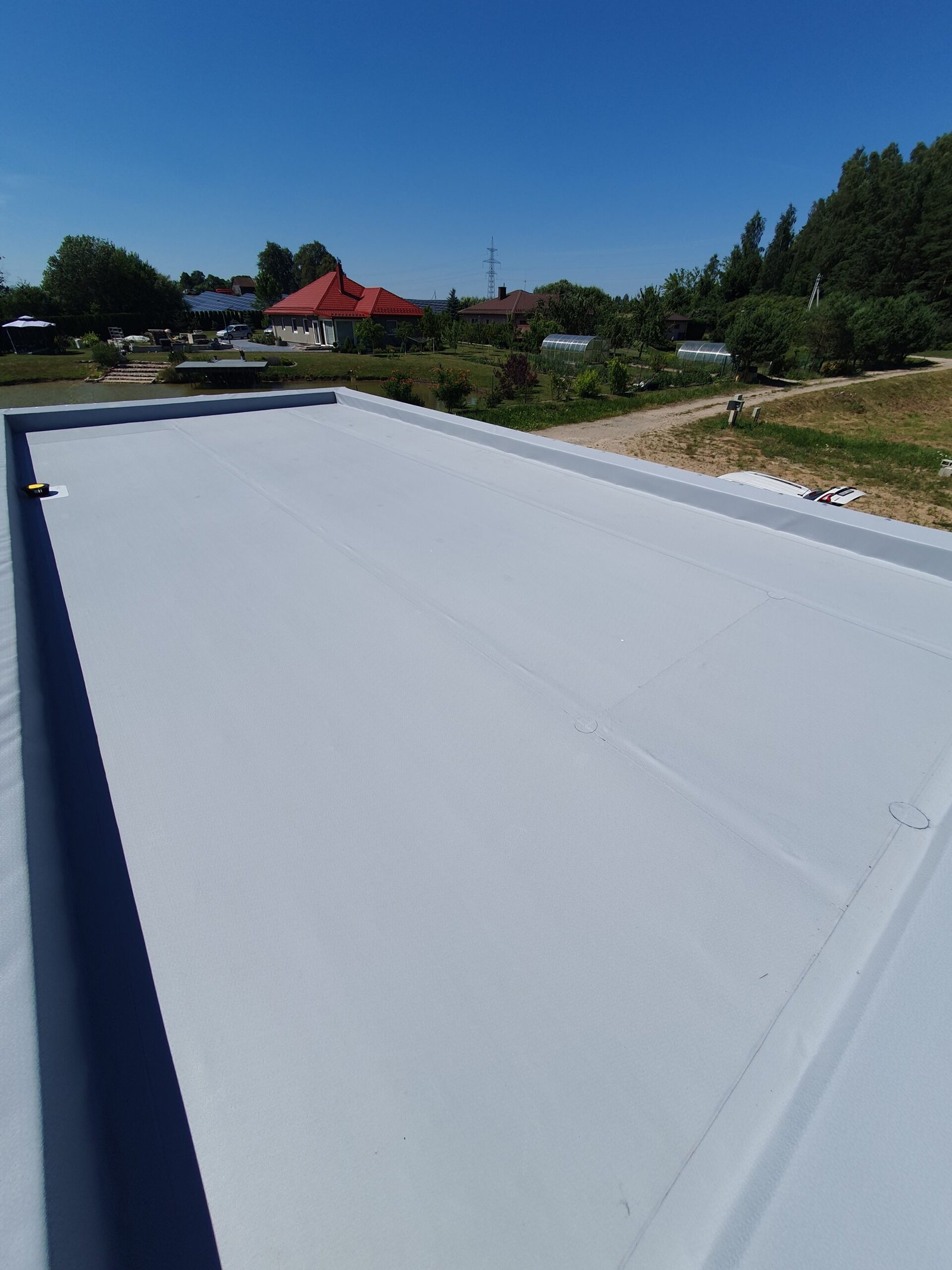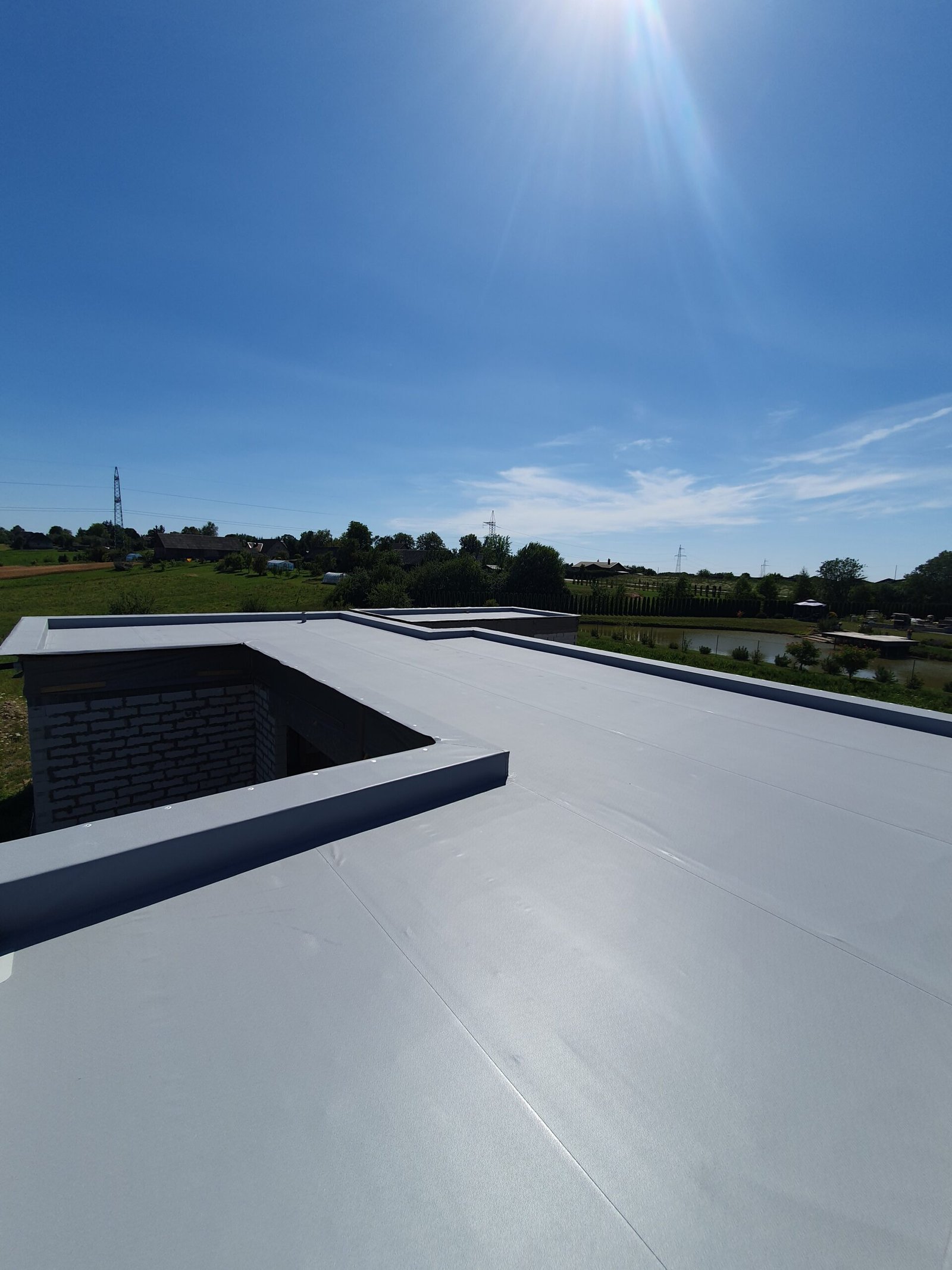 ✓ Namo ir priestato stogas uždengtas Protan PVC danga 260 m2.
